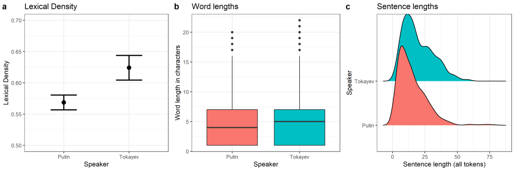 Tokayev actually stole the show from Putin during the question-and-answer session, appearing more stately and presidential. His Russian language was more complex and stylistically appropriate than Putin’s. The figures below show a) lexical density (the proportion of content words to function words), b) word lengths and c) sentence lengths in both presidents’ speech. Tokayev’s measures are higher than Putin’s. Let’s hope Dunyasha did not add novichok to his drink afterwards.