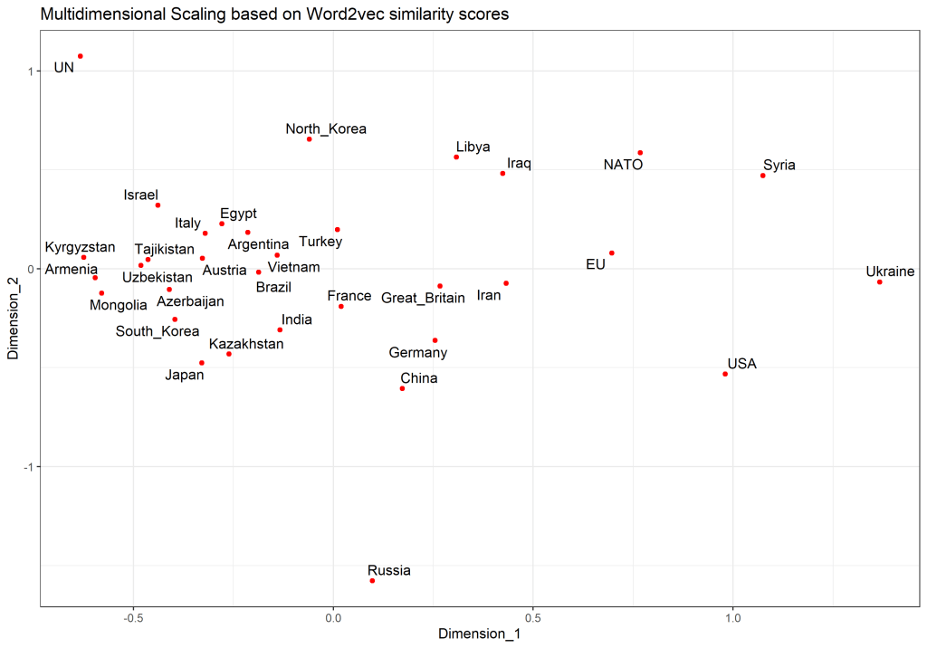 The results of my word2vec analysis are shown below. Despite Putin’s claims, they reveal a bipolar, rather than a multipolar world. On the right, there is Ukraine, NATO, the USA and the EU. On the left we find Russia’s “friends “, including the ex-republics of the USSR. Individual European countries are in-between (perhaps depending on the amount of Russian money invested in them). Syria, Libya and Iraq are close to NATO because they are all mentioned in contexts related to wars.