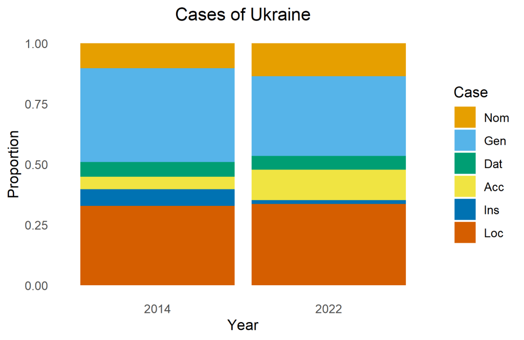 As for ‘Ukraine’, there are unfortunately not so many uses in the corpus. Only in 2022 and 2014, the year when the Crimea was annexed, is the total number of different case forms of ‘Ukraine’ above 100. The proportions are, again, quite similar, as you can see in the plot below.