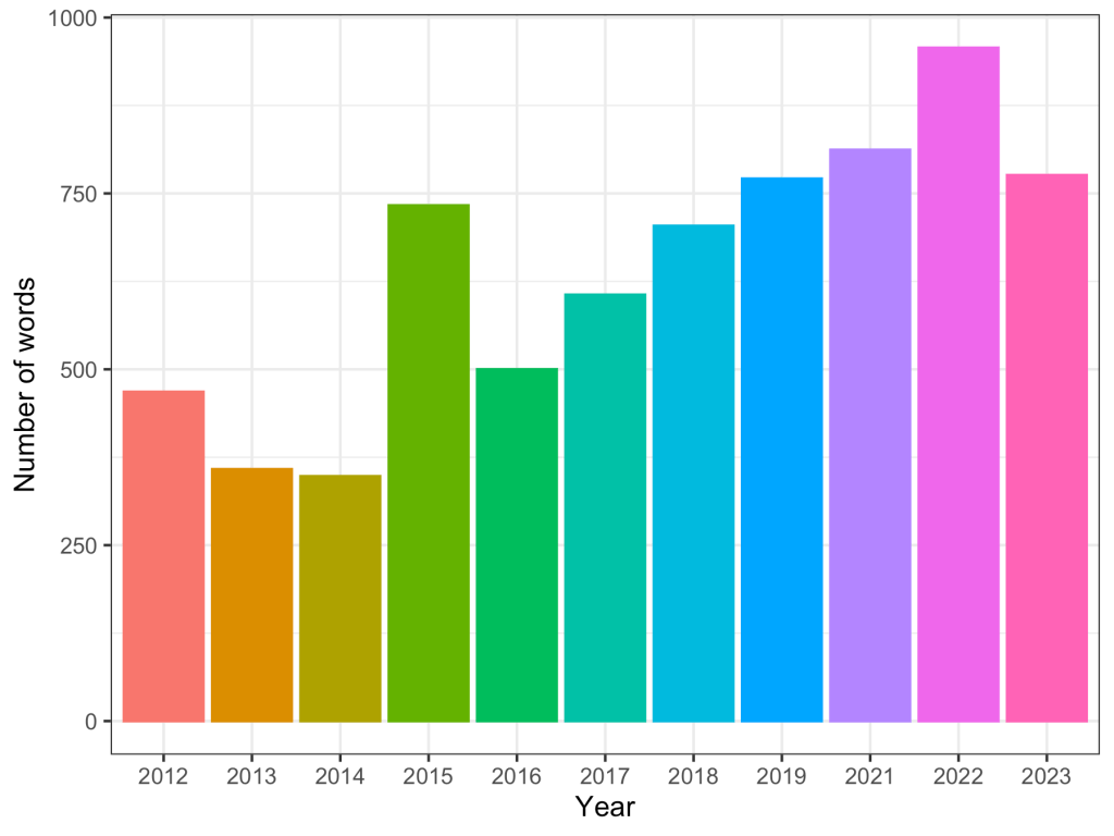 Even the traditional speech by Vladimir Putin contained only 776 words, which was about 19% less than last year’s speech with 957 words. This marks the end of the continuous increase in the speeches’ lengths over past years, as one can see in the figure below. A sign of fatigue?